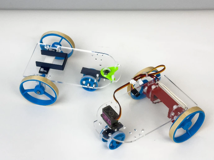 With the Floor Riders Add-On, students work with a simple remote-controlled motorized platform and experiment with different control strategies, such as steering behavior, speed control, mixing, and responsiveness. This helps them understand how the same software logic can control different mechanical systems and environments.
