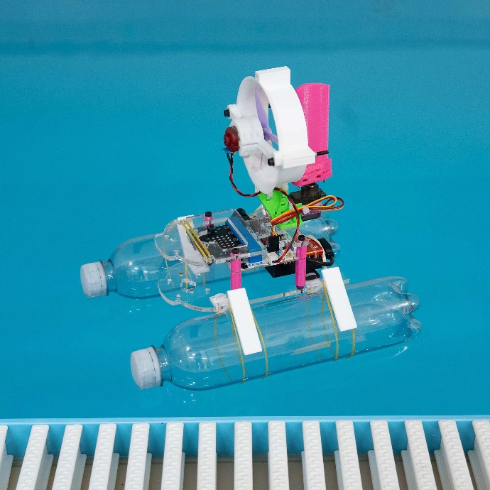 Students 3D-print fins in different sizes and shapes, combine them with various bottle sizes and bottle shapes, and test the BottleBoat on the water to see how each combination changes speed, stability, and how straight the boat moves.