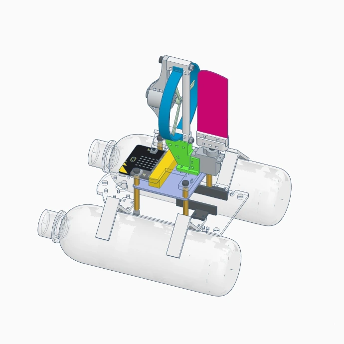 Students 3D-print fins in different sizes and shapes, combine them with various bottle sizes and bottle shapes, and test the BottleBoat on the water to see how each combination changes speed, stability, and how straight the boat moves.
